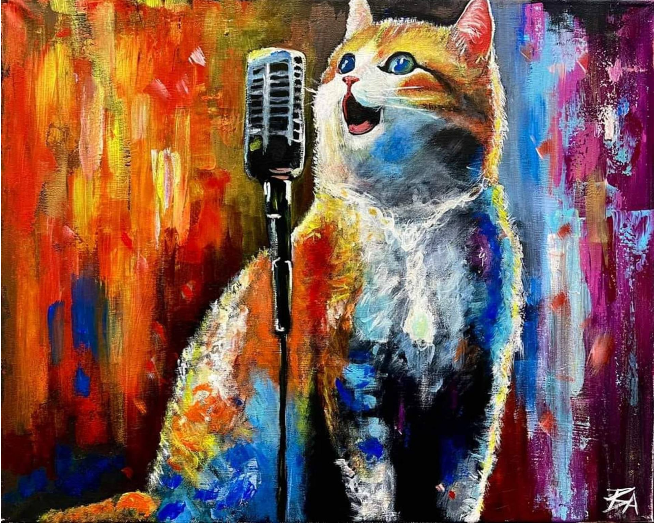 Bring music, mischief, and vibrant energy into your space with MeowRina, a 16" x 20" original acrylic painting by artist Behram Agha. This whimsical piece features a charismatic cat mid-performance, passionately singing into a vintage microphone. With bold, impressionistic brushstrokes and radiant colors, Behram captures the quirky soul of this musical feline in a way that is both playful and powerful.